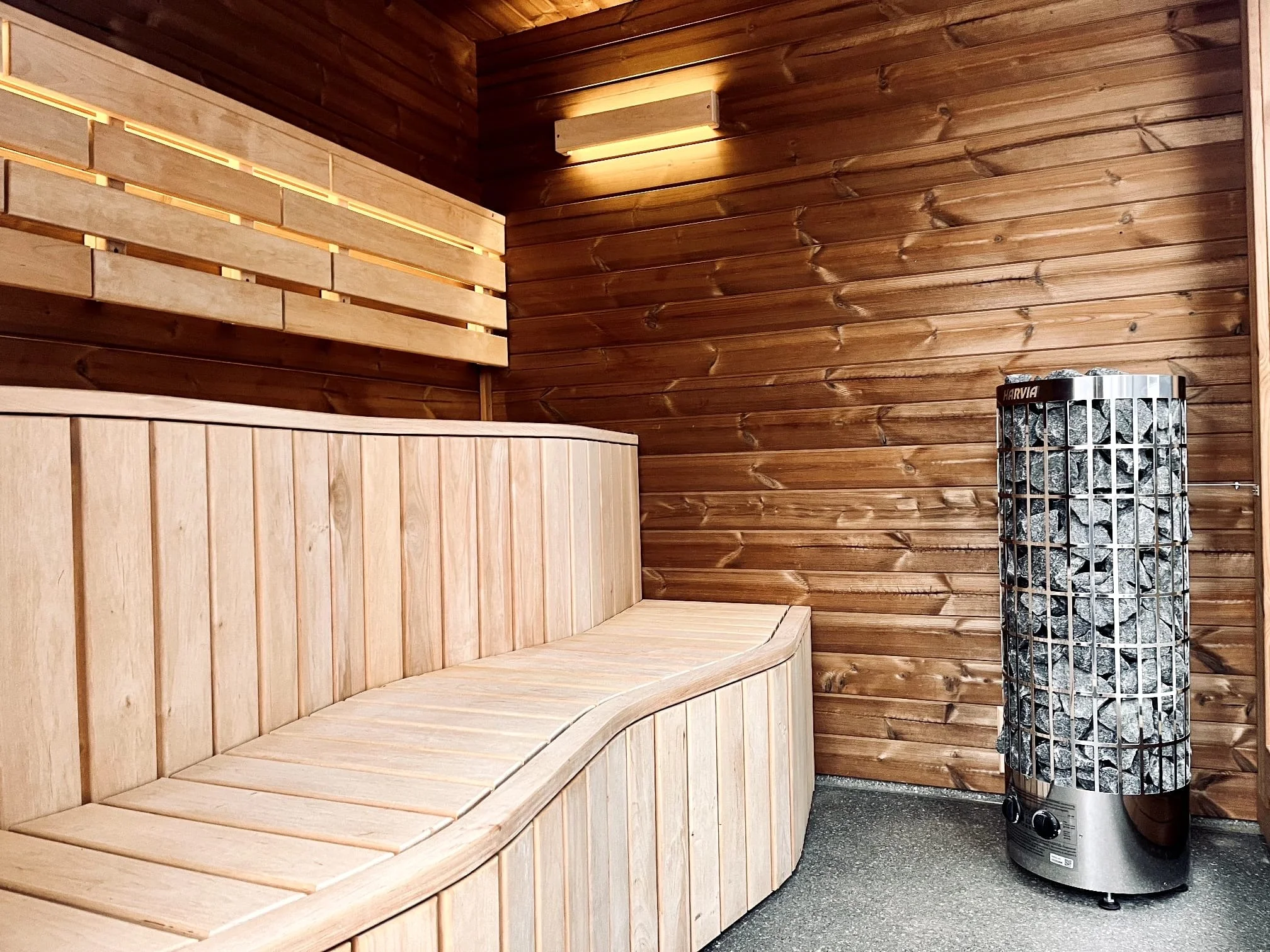 Ein integrierter Harvia Cilindro Elektro-Saunaofen (10,4 kW) gewährleistet eine gleichmäßige, intensive Wärmeverteilung.