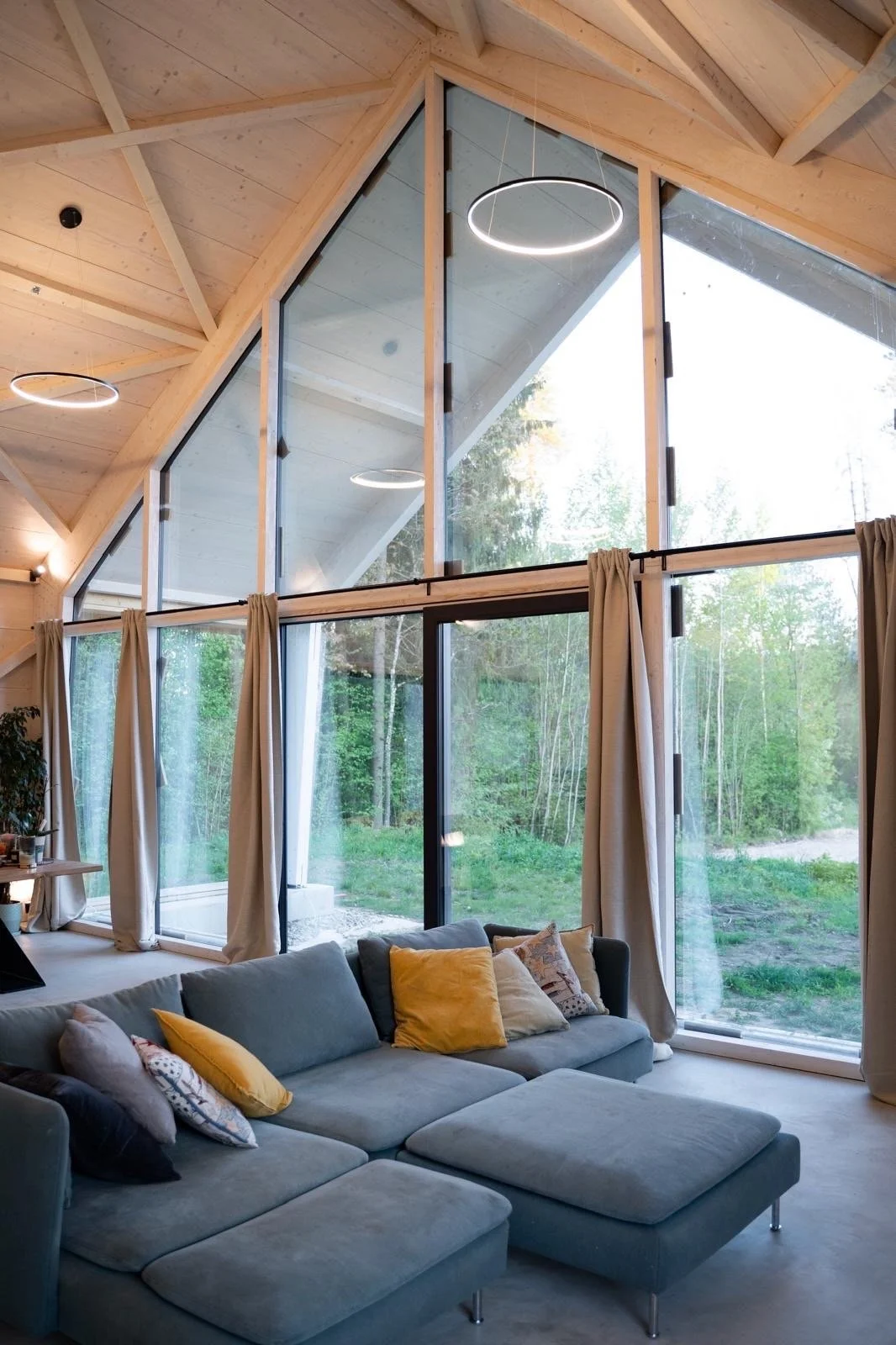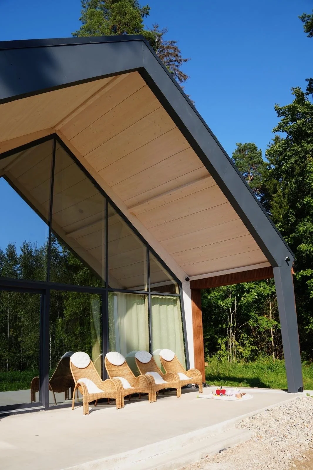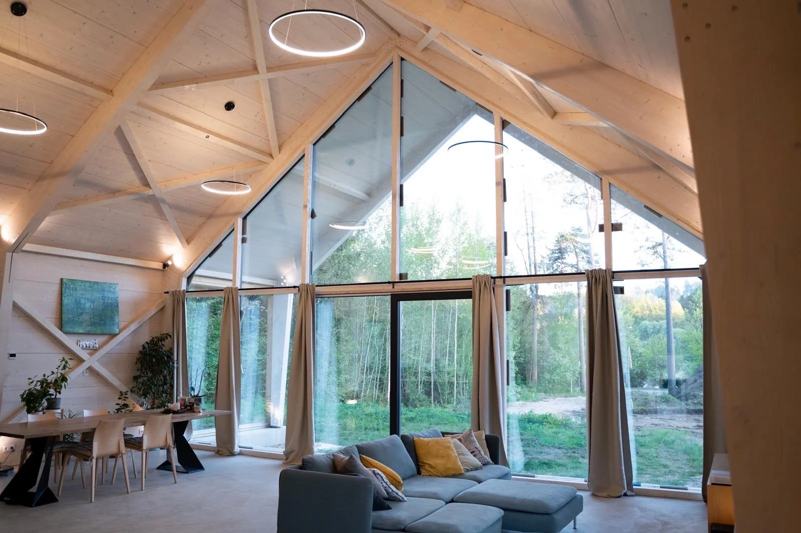 In der Konstruktion werden Brettschichtholz (BSH), 300 mm Wärmedämmung und ein RUUKI-Metalldach verwendet – für Langlebigkeit und Komfort das ganze Jahr über. Dreifachverglasung sorgt im Winter für Wärme und ermöglicht im Sommer die Nähe zur Natur in vollen Zügen zu genießen.